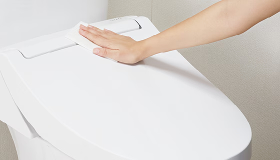 アメージュ便器は、汚物よごれがツルンっと落ち、水アカもこびりつかない新素材