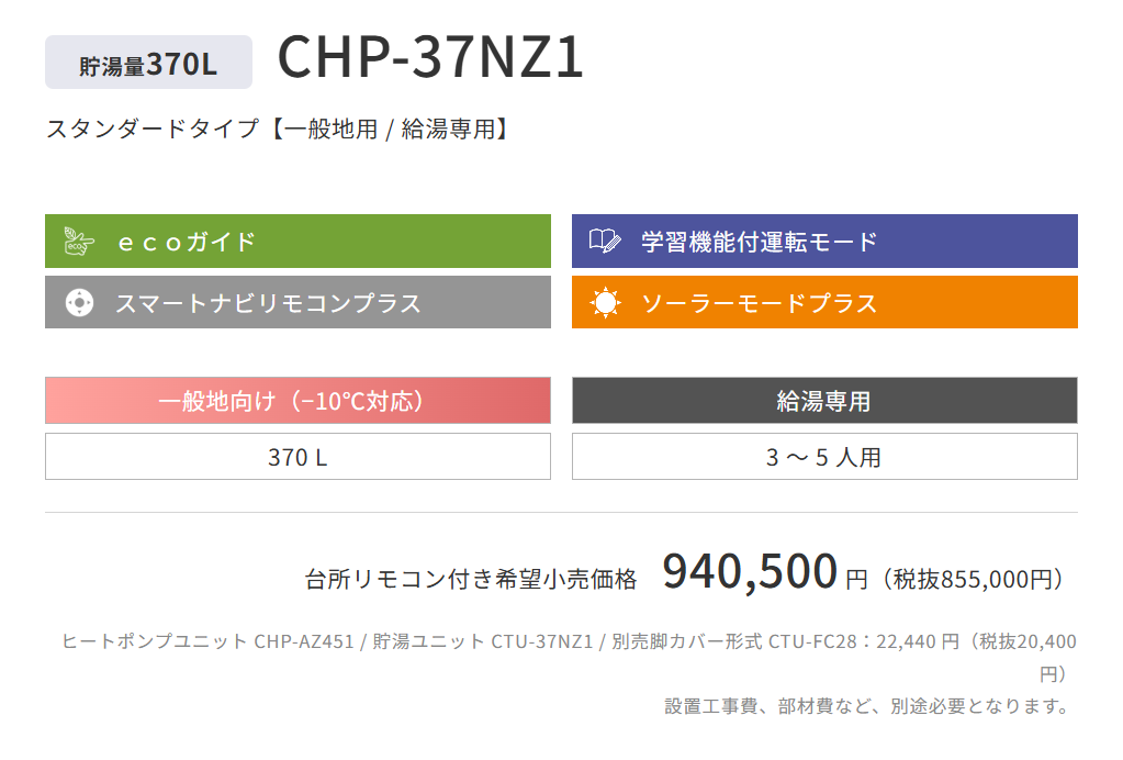 (CHP‑AZ451+CTU‑37NZ1、370 L/3〜5人用、給湯専用タイプ)