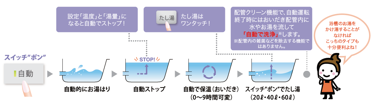 スイッチ“ポン”で設定湯量と温度の湯はりから保温( おいだき)まで自動で行ないます。