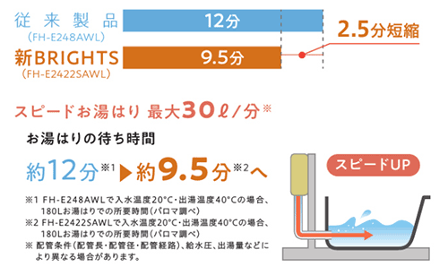 ブライツシリーズは、最大湯量の上限がアップされ、自動湯はりが、スピードアップしました。入浴待ち時間が短くなり、一刻も早く入浴したいタイミングに対応します。スピードお湯はり最大30ℓ/分