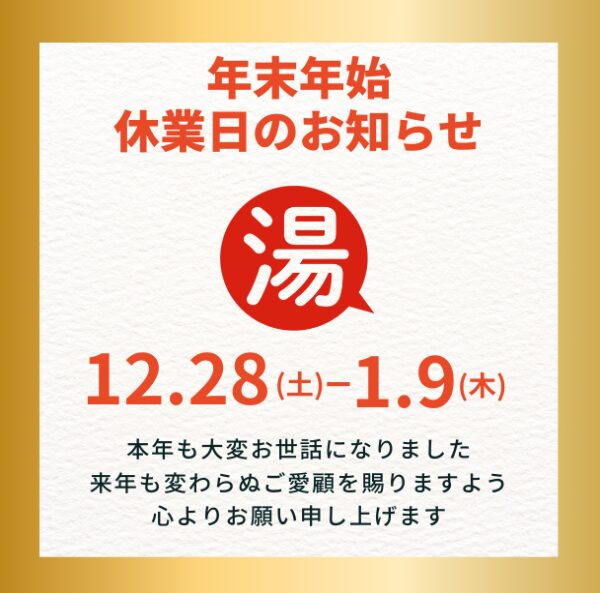 年末年始休業のお知らせ | イベント&お知らせ | 全農リフォーム湯ったり~な お問い合わせ お問い合わせ 簡単お見積り 来店予約 LINE リフォームメニュー 給湯器 エコキュート コンロ レンジフード トイレ 洗面台 キッチン ユニットバス すべて見る 施工事例 給湯器 コンロ レンジフード トイレ 洗面台 キッチン ユニットバス すべて見る イベント&お知らせ 会社案内 会社案内 ショールーム 選ばれる理由 お役立ち情報 リフォームの流れ よくある質問 保証&サポート