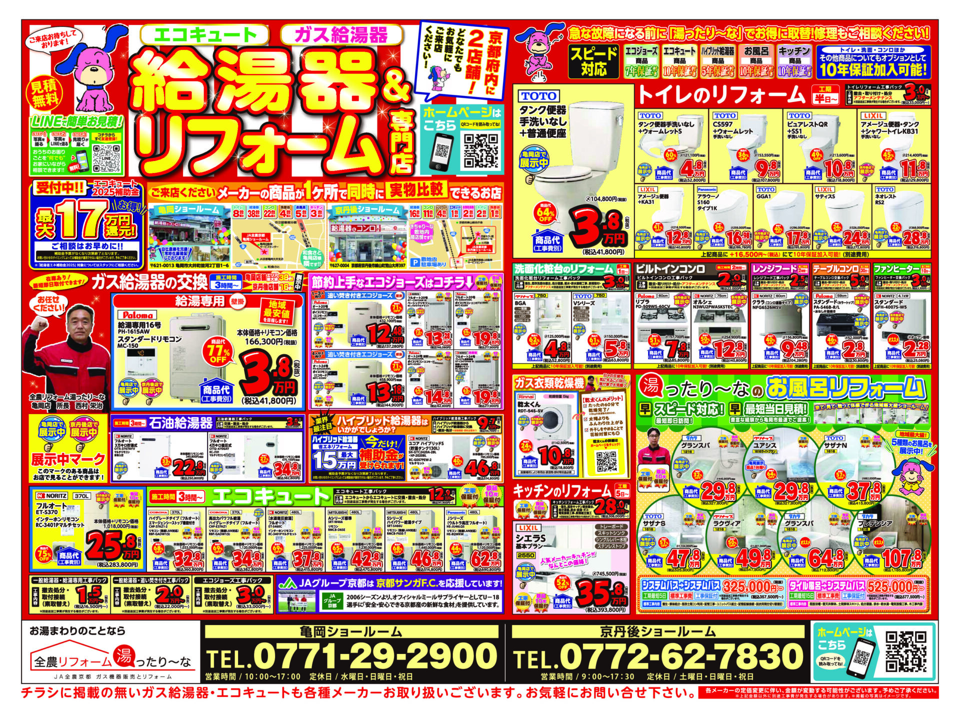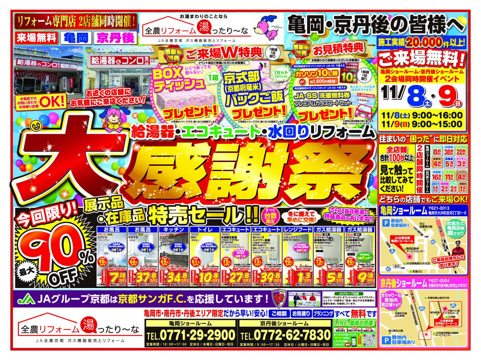 2025大感謝祭 | イベント&お知らせ | 全農リフォーム湯ったり~な お問い合わせ お問い合わせ 簡単お見積り 来店予約 LINE リフォームメニュー 給湯器 エコキュート コンロ レンジフード トイレ 洗面台 キッチン ユニットバス すべて見る 施工事例 給湯器 コンロ レンジフード トイレ 洗面台 キッチン ユニットバス すべて見る イベント&お知らせ 会社案内 会社案内 ショールーム 選ばれる理由 お役立ち情報 リフォームの流れ よくある質問 保証&サポート
