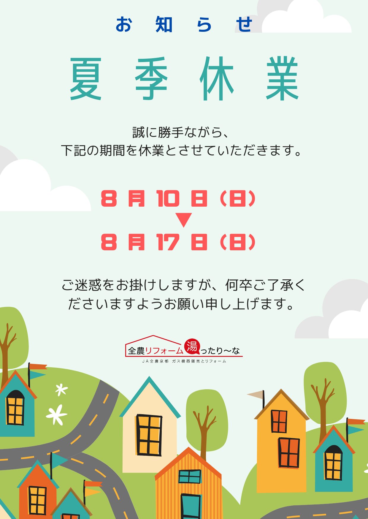 休業のお知らせ | イベント&お知らせ | 全農リフォーム湯ったり~な お問い合わせ お問い合わせ 簡単お見積り 来店予約 LINE リフォームメニュー 給湯器 エコキュート コンロ レンジフード トイレ 洗面台 キッチン ユニットバス すべて見る 施工事例 給湯器 コンロ レンジフード トイレ 洗面台 キッチン ユニットバス すべて見る イベント&お知らせ 会社案内 会社案内 ショールーム 選ばれる理由 お役立ち情報 リフォームの流れ よくある質問 保証&サポート